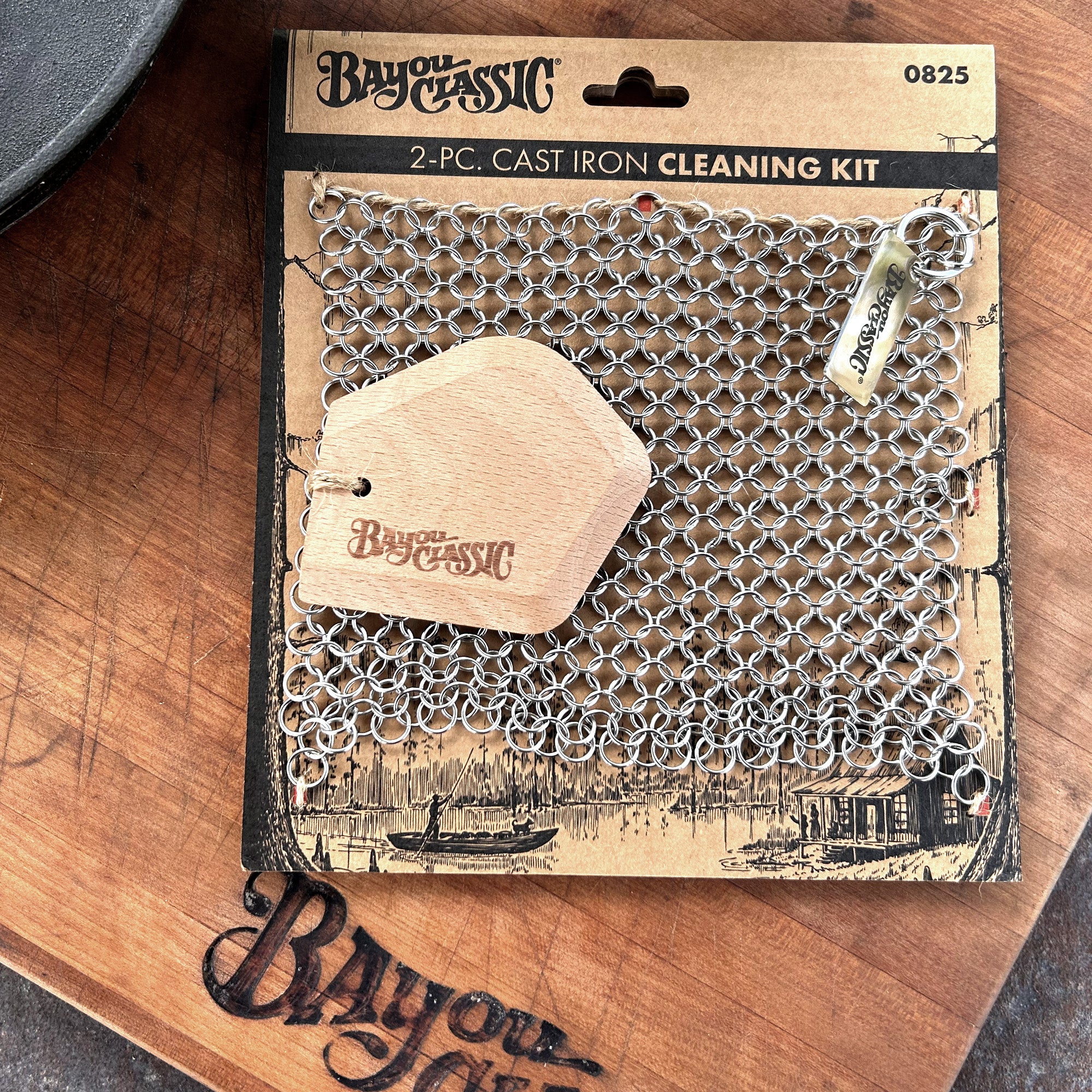 These tools follow all the classic rules for removing stuck-on food from your beloved seasoned cast iron. No additional sponges or materials needed. Simply run the chainmail over cooking surfaces to pull away leftover crumbs, and utilize the multi-angle Beech wood scraper to get into those hard to reach corners of your cookware. After cleaning, always thoroughly dry your cookware and follow the appropriate instructions for seasoning. This will prepare your Bayou® Cast Iron for the next meal and the next generation!