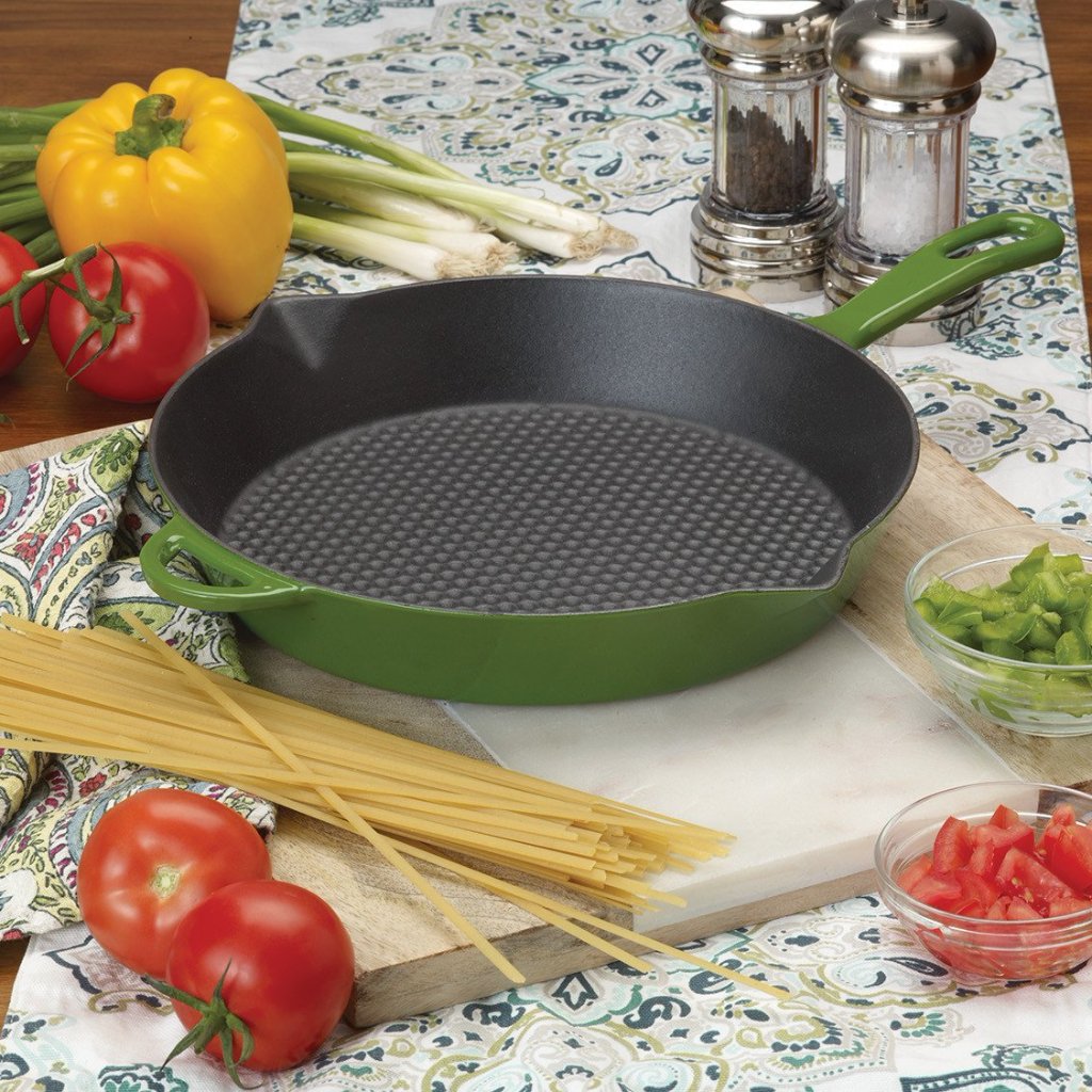 Dimple technology transfers and retains heat evenly, making this skillet ideal for searing and braising. Easy elegance comes from the combination of classic cast iron durable enamel exterior and interior surface and cypress green color. Bayou Classic® helps to make the kitchen the heart of the home a relaxed place to cook gather and eat.