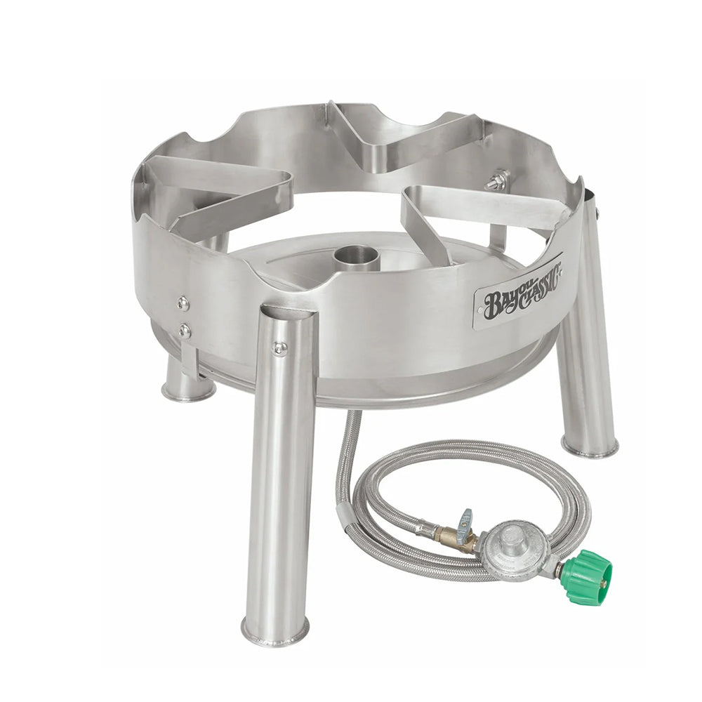 Bayou Classic Stainless Jet Cooker features a 16-inch wide cooking surface on a 12.5-in tall frame which provides a low center of gravity to better support large size stockpots, plus enhances safety when inserting or removing inner baskets.