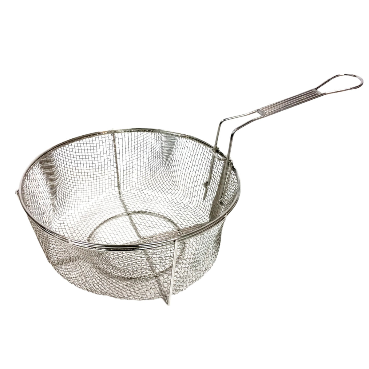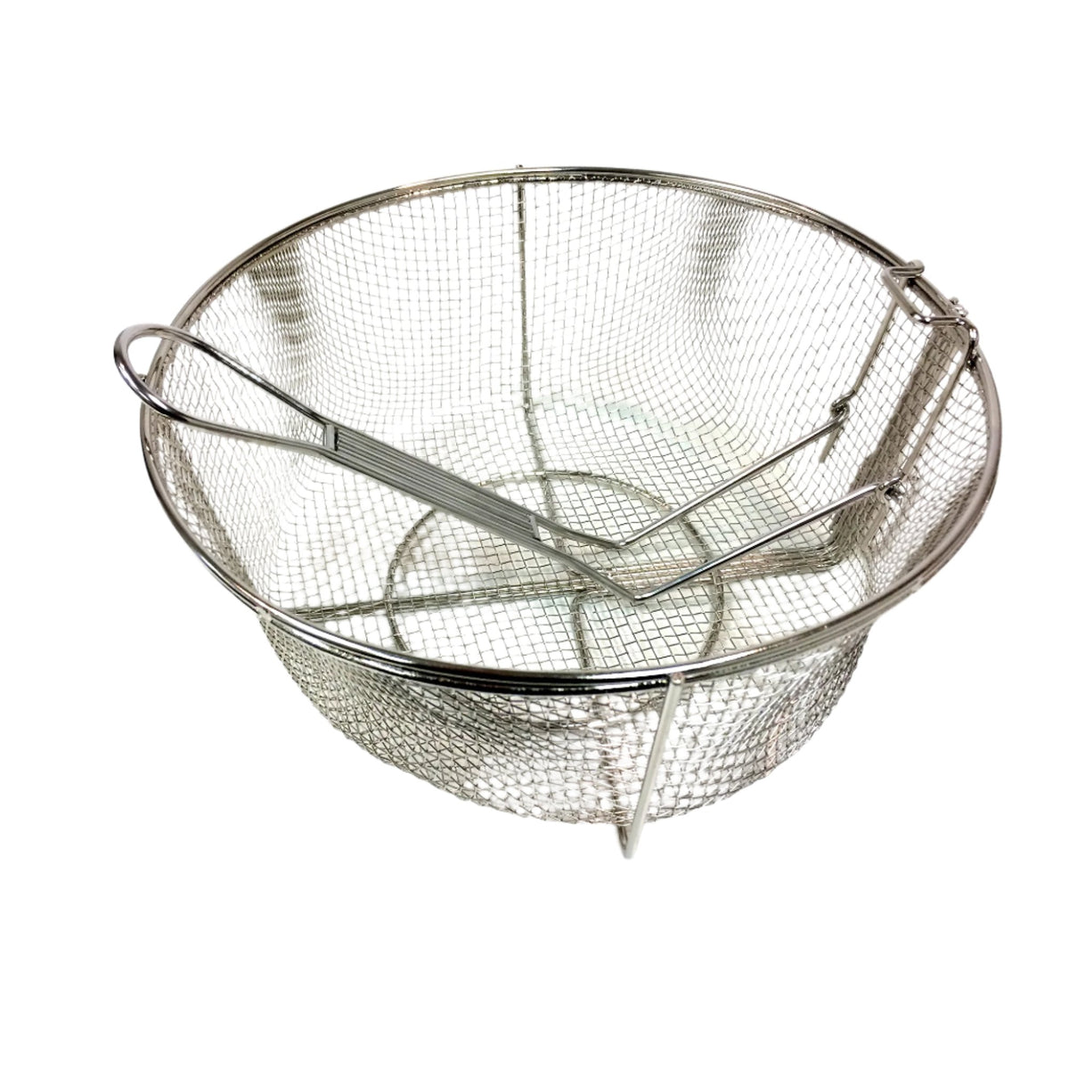 The 11.5-in x 5-in basket supports large size fillets, while the handle keeps the cook at a safe distance from hot oil. The wire mesh basket with drain hook rapidly drains cooking oil away from fried fish, chicken, shrimp, onion rings, hushpuppies, and fries. When cooking and clean-up are complete, the handle folds for easy storage.