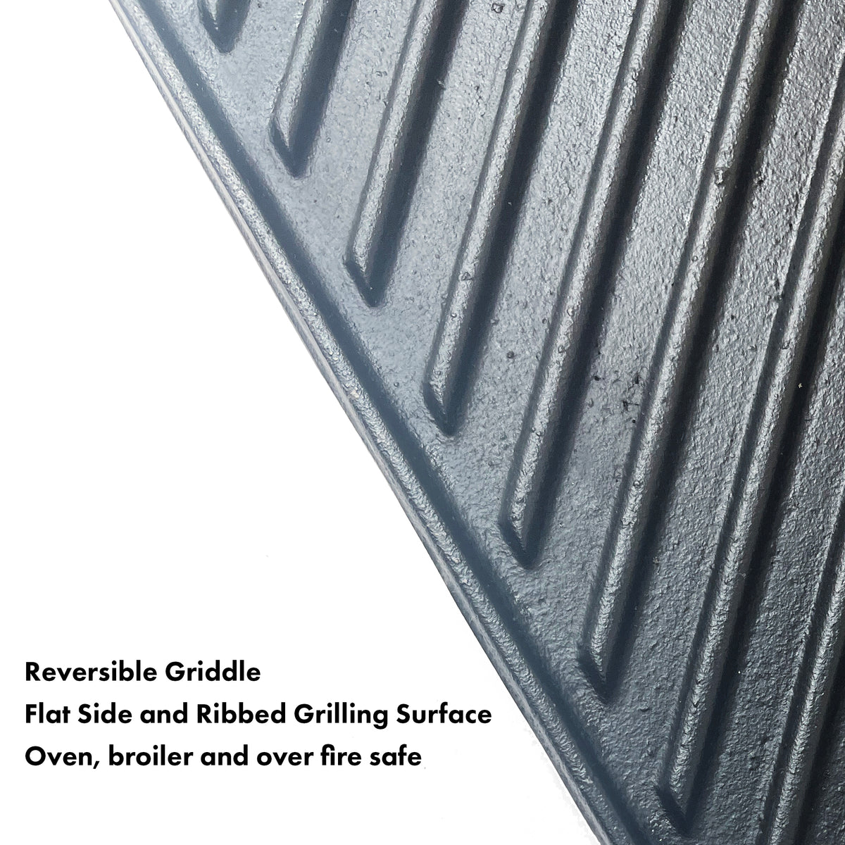 The flat side cooks a large batch breakfast, burgers, and grilled sandwiches. On the grill side, elevated ribs achieve enticing sear marks while sealing in natural juices of steak, chicken, pork chops, and vegetables.