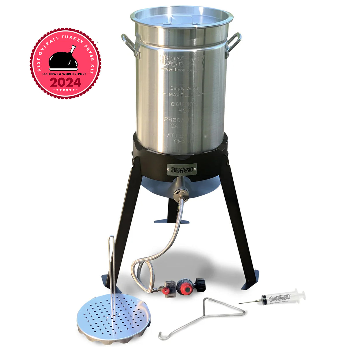 Bayou Classic® 30-qt Aluminum Turkey Fryer is specifically designed to fry up to an 18-lb whole turkey in as little as 45 minutes.