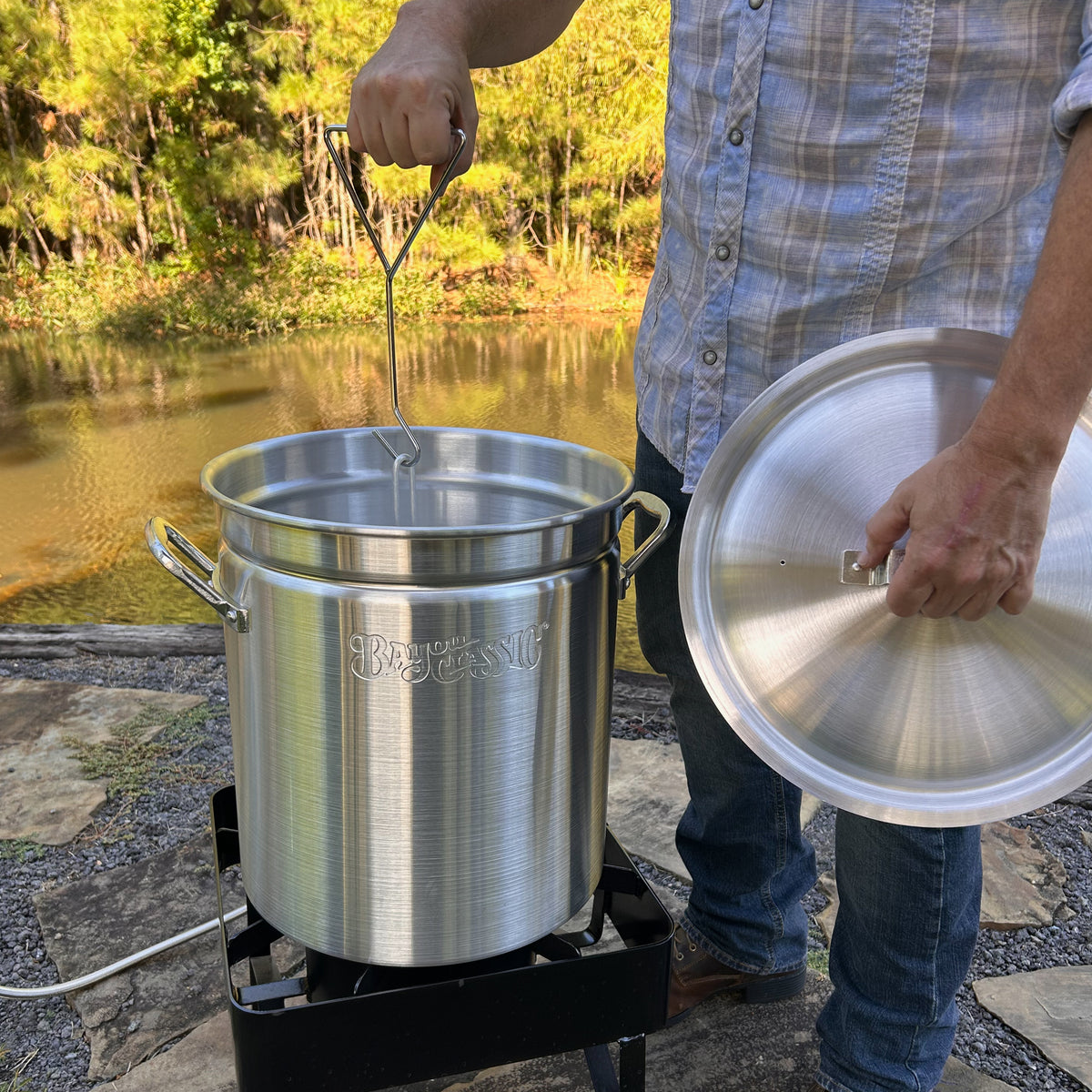 This versatile stockpot can also be used for large batch outdoor cooking of shrimp, crabs, corn, peanuts, and low country boil.