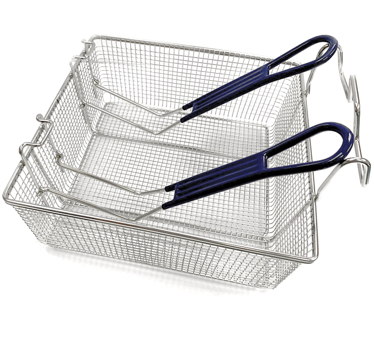 The Double Fryer Basket is the perfect way to fry large batches of fish, chicken, shrimp, onion rings, fries, and hushpuppies.